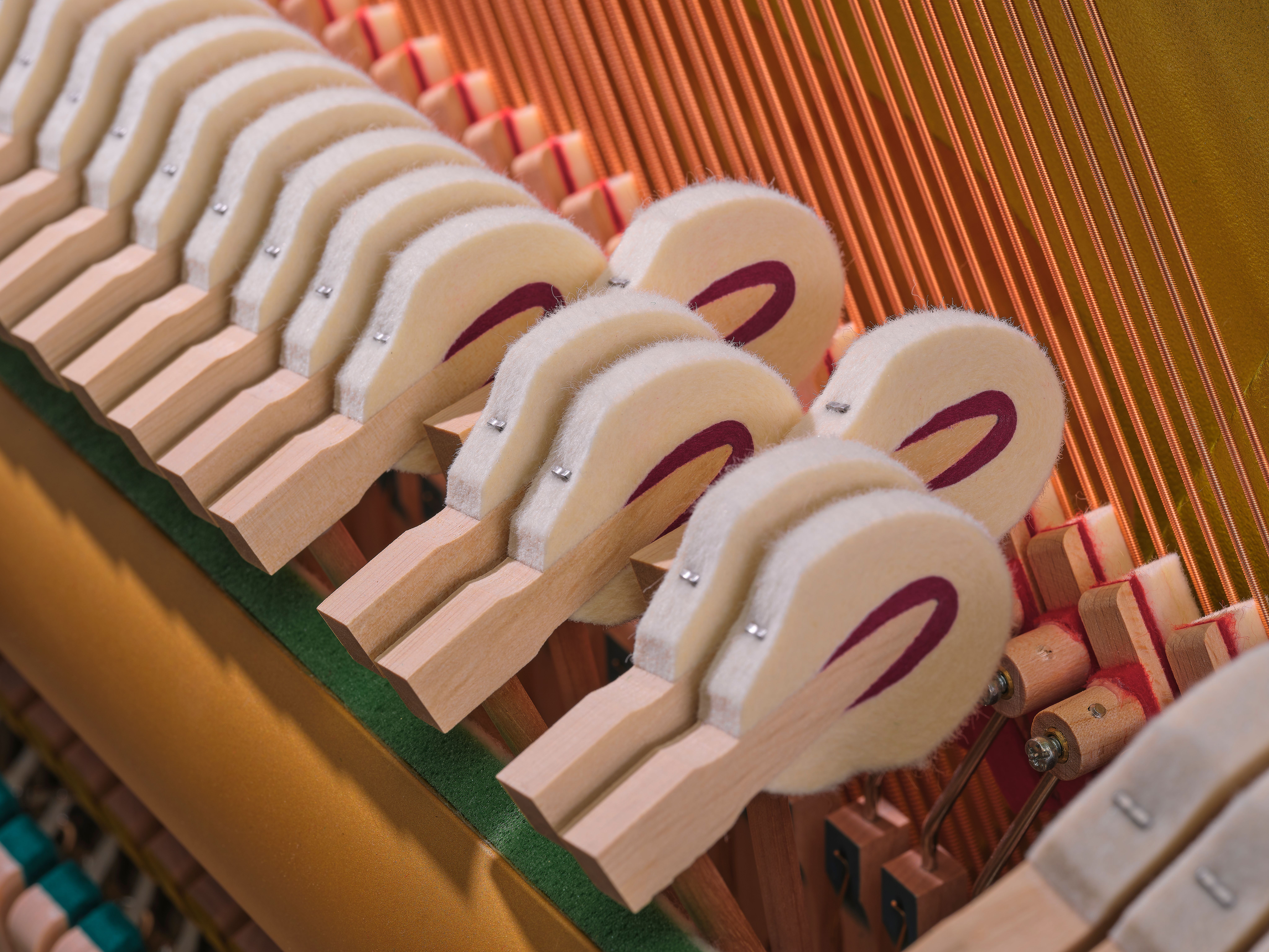 Ook zijn de modellen voorzien van verbeterde hamers, die zorgen voor een heldere en zuivere toon. De vijf achterste steunpalen ondersteunen de constructie en helpen de zangbodem in goede conditie te houden. Hierdoor blijft de piano stabiel klinken en prettig reageren op je spel.